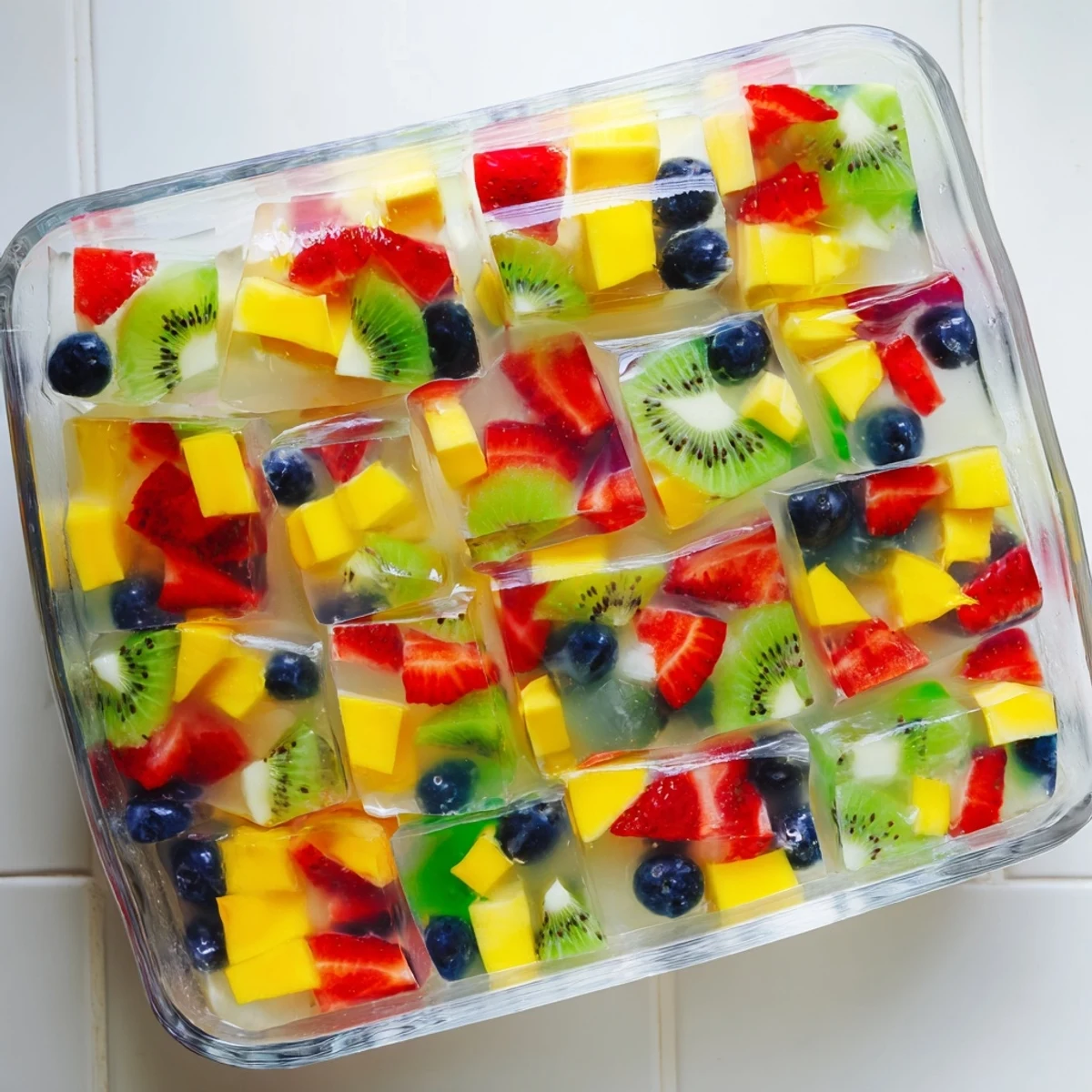 I made this for my niece who was suspicious of anything vegan. She watched me pour the liquid over the strawberries and mango cubes, absolutely convinced the fruit would float to the top. When I served her that first wobbly square, her eyes went wide. She asked for seconds before she even finished the first piece.