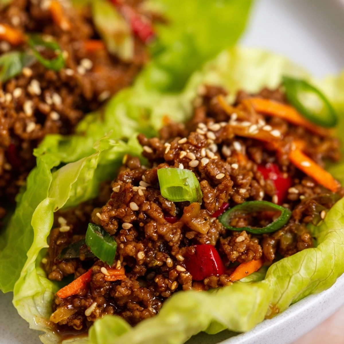 This dish features lean ground beef cooked with aromatic onion, garlic, and ginger, then combined with tender red bell pepper, shredded carrots, and optional water chestnuts. A sauce of hoisin, soy, rice vinegar, and sesame oil delivers a sweet and tangy flavor that coats the mixture. The savory filling is served wrapped in fresh, crisp lettuce leaves and garnished with sliced green onions and toasted sesame seeds for an added crunch and depth of flavor. Ready in just over half an hour, it balances hearty protein with fresh vegetables in a light presentation.