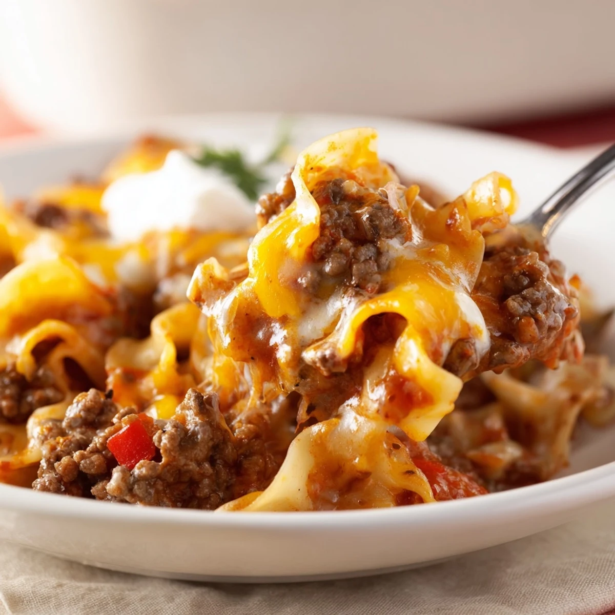 This casserole starts with browned ground beef sautéed with onion, garlic and bell pepper, then simmers in tomato sauce, diced tomatoes and a splash of beef broth seasoned with oregano and basil. Fold in cooked egg noodles and sour cream, top with shredded cheddar and bake 20–25 minutes at 375°F until bubbly. Garnish with parsley and serve with a green salad or garlic bread.