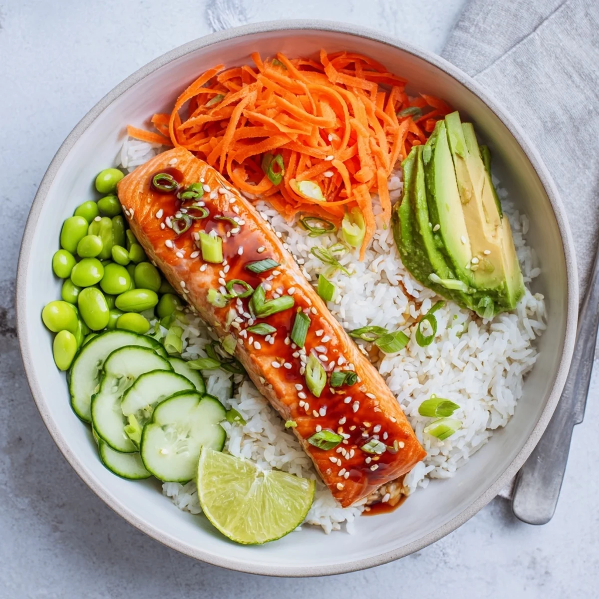 Salmon fillets are seasoned, brushed with a honey, soy, lime, garlic and ginger glaze, then baked until caramelized. Serve over fluffy jasmine or brown rice with julienned carrot, cucumber, cooked edamame and sliced avocado. Finish with toasted sesame seeds, green onions and a squeeze of lime. Swap quinoa or cauliflower rice to lighten the bowl and adjust glaze for more heat or acidity.