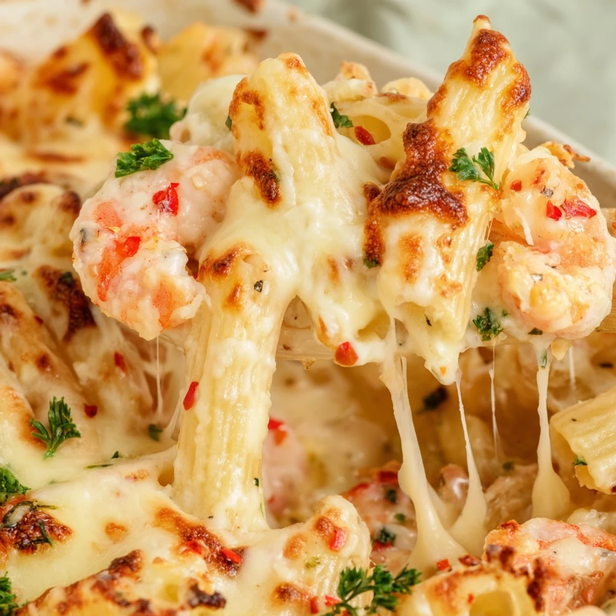 This comforting pasta bake combines tender shrimp with al dente penne in a velvety lemon-garlic cream sauce. The dish comes together with sautéed shallots and white wine, then bakes until the mozzarella and parmesan form a golden, bubbly crust. Perfect for weeknight dinners or entertaining, this Italian-American classic delivers restaurant-quality results with minimal fuss.